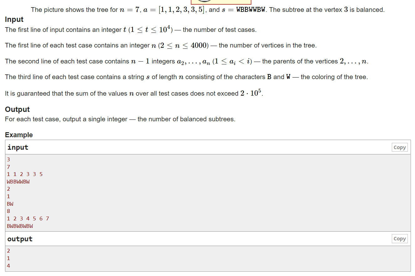 1. 배열을 생성 후 arr[index] = value - 1 (부모 노드)를 저장해준다.2. 문자열을 byte배열로 받고 getBytes()를 써준다. ( == charAt)3. 새로운 배열(kk)을 생성하고 각 노드마다 검은색이면 -1, 하얀색이면 1을 저장해준다.4. 위의 규칙에 따라 index가 높은 노드들은 무조건 하위노드이기 때문에 뒤에서 부터 index의 부모 노드들에 자기 자신의(kk)배열을 더해준다. (하얀색과 검은색의 수가 같다면 0, 검은색이 많다면 -1 < ...)5. kk 배열을 다시 탐색해 0인것(하얀색과 검은색의 수가 같은것) 이 있다면 결과값을 추가해준다.