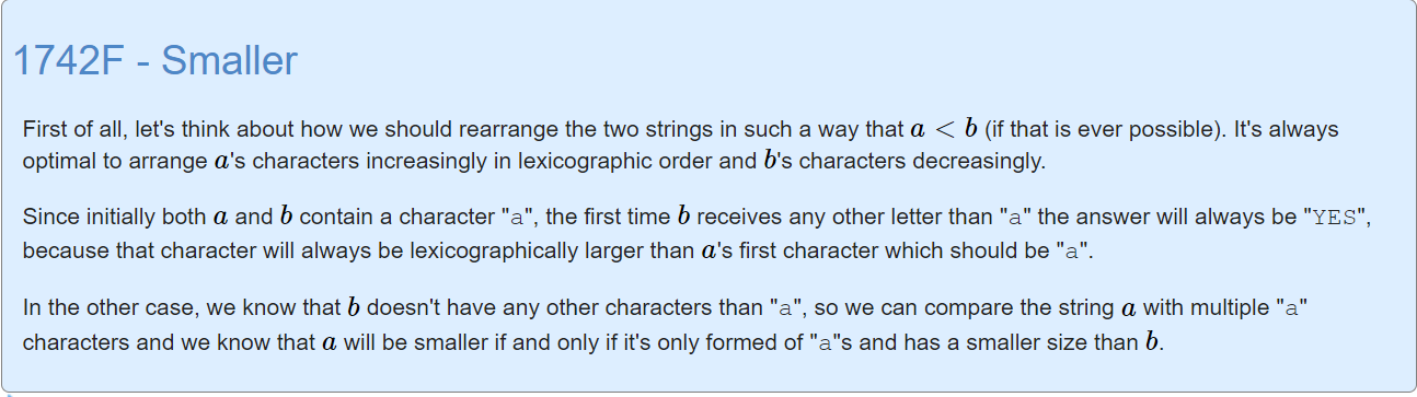 (s,t 첫 문자열은 "a"에서 시작한다. 문자열마다 a는 무조건 있고 t에 'a' 이외의 다른 문자가 있다면 이 문자를 t문자열 맨 앞에 배치하고 s문자열 맨 앞에는 a를 배치하면 된다.)