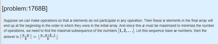 ※. n개의 배열 중 순서대로 있는 원소(w)를 뺀 후 작업해야 하는 나머지 원소(n-w)를 k로 나누어 준다.