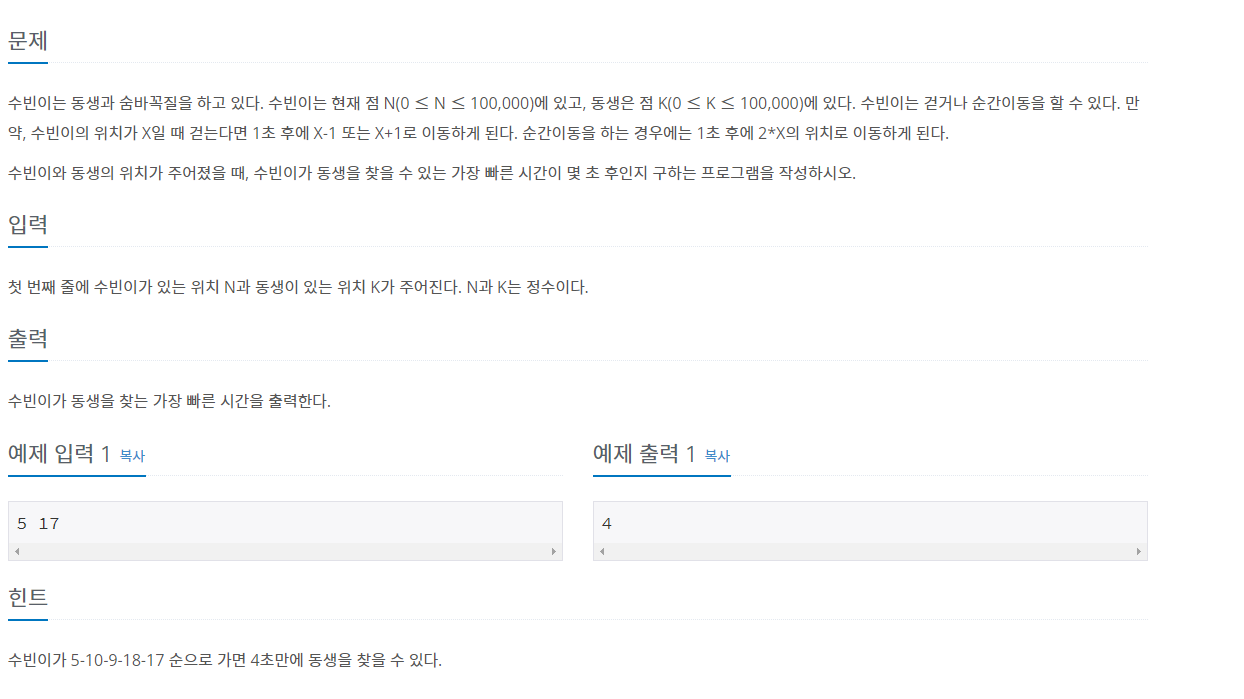 BFS (너비 우선 탐색, Breadth-First Search) 알고리즘에서 기본적인 문제 하나를 풀어보도록 하겠습니다. 문제 1697번: 숨바꼭질 (acmicpc.net) 1697번: 숨바꼭질 수빈이는 동생과 숨바꼭질을 하고 있다. 수