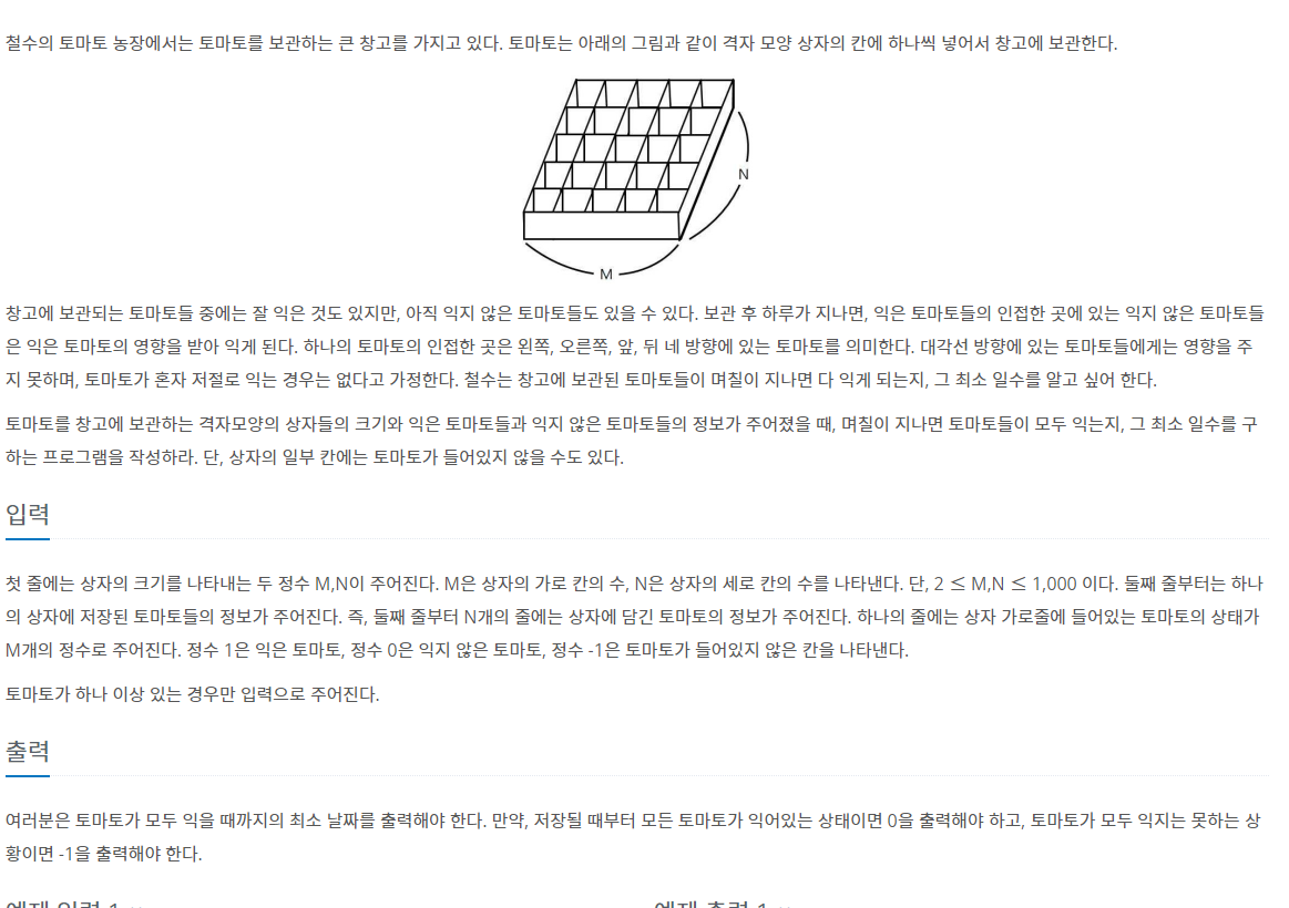 문제 번호 7576(https://www.acmicpc.net/problem/7576) 문제 및 입/출력 철수의 토마토 농장에서는 토마토를 보관하는 큰 창고를 가지고 있다. 토마토는 아래의 그림과 같이 격자 모양 상자의 칸에 하나씩